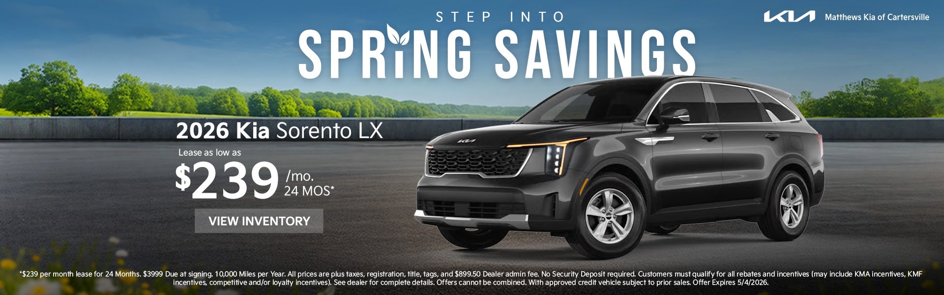 "Although every reasonable effort has been made to ensure the accuracy of the information contained on this site, absolute accuracy cannot be guaranteed. We will be updating technology for inventory which could affect the pricing. This site, and all information and materials appearing on it, are presented to the user "as is" without warranty of any kind, either express or implied. All vehicles are subject to prior sale. Price does not include applicable tax, title, license, processing and/or documentation fees, and destination charges. If you choose not to finance with Matthews Kia of Cartersville, the price of the vehicle selected for purchase will be $1,049 higher than the advertised price. Doc Fee of $899. See dealer for details."